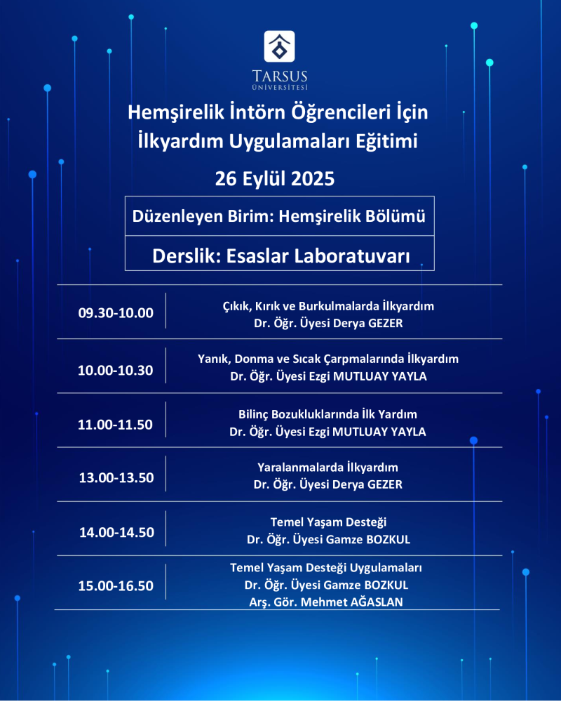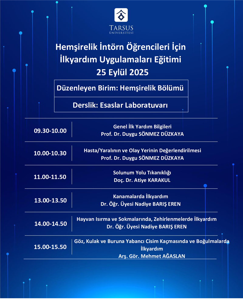 Hemşirelik Bölümümüzce değerli öğretim elemanlarımızın sunumlarıyla ve intörn öğrencilerimizin katılımlarıyla 25-26 Eylül 2025 tarihlerinde "İntörn Öğrencilerimize Yönelik İlk Yardım Eğitimi" düzenlenmiştir. Eğitimde Genel İlk Yardım Bilgilerinden Kanamalarda İlk Yardım Uygulamalarına; Çıkık, Kırık ve Burkulmalarda İlk Yardım Uygulamalarından Temel Yaşam Desteğine kadar birçok farklı konu ele alınmıştır. Emeği geçen öğretim üyelerimize ve katılım sağlayan öğrencilerimize teşekkür ediyoruz ...