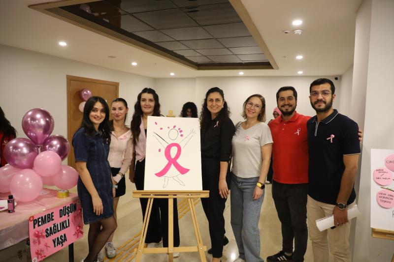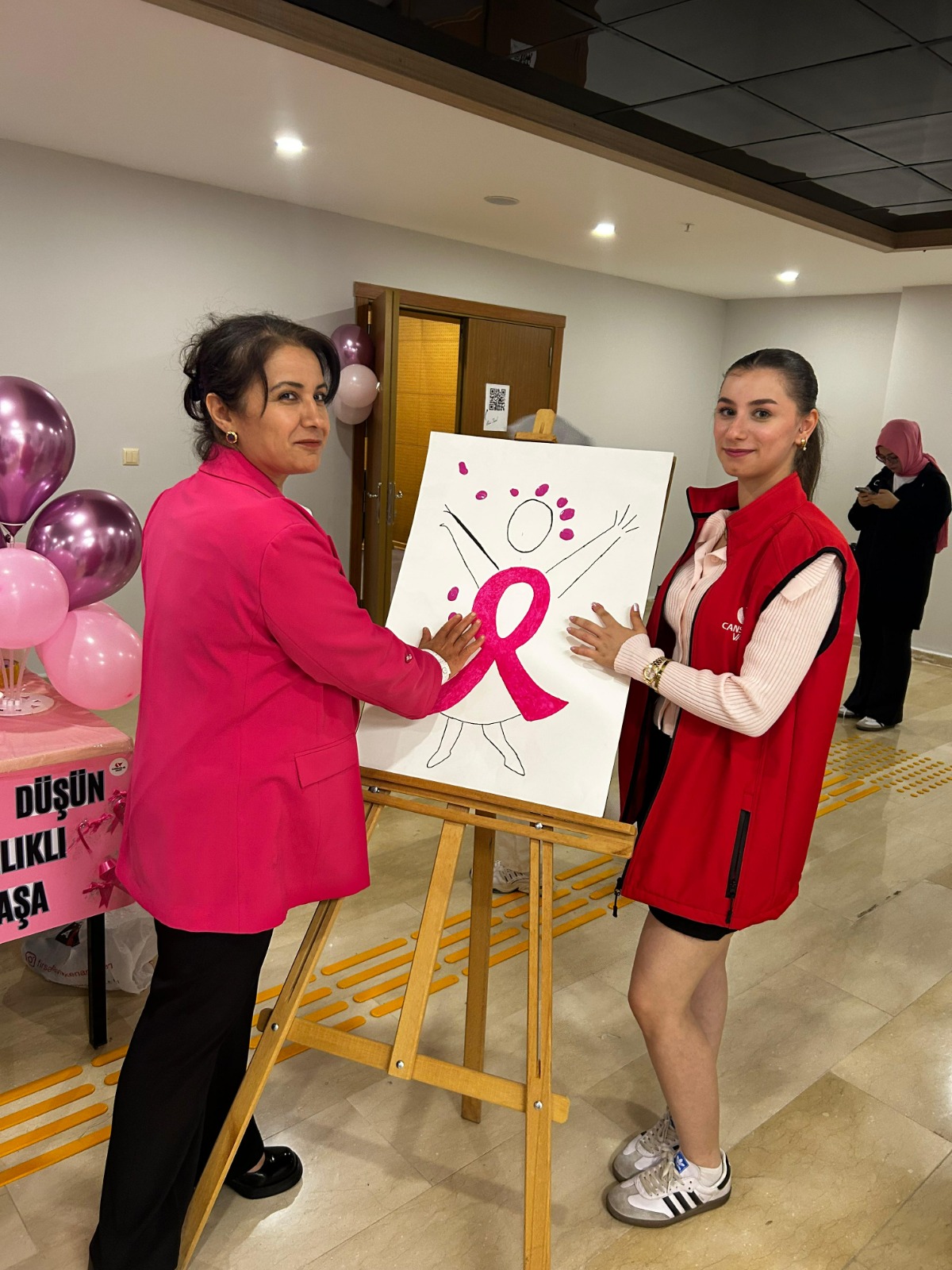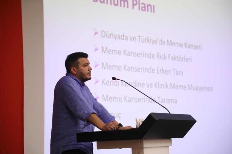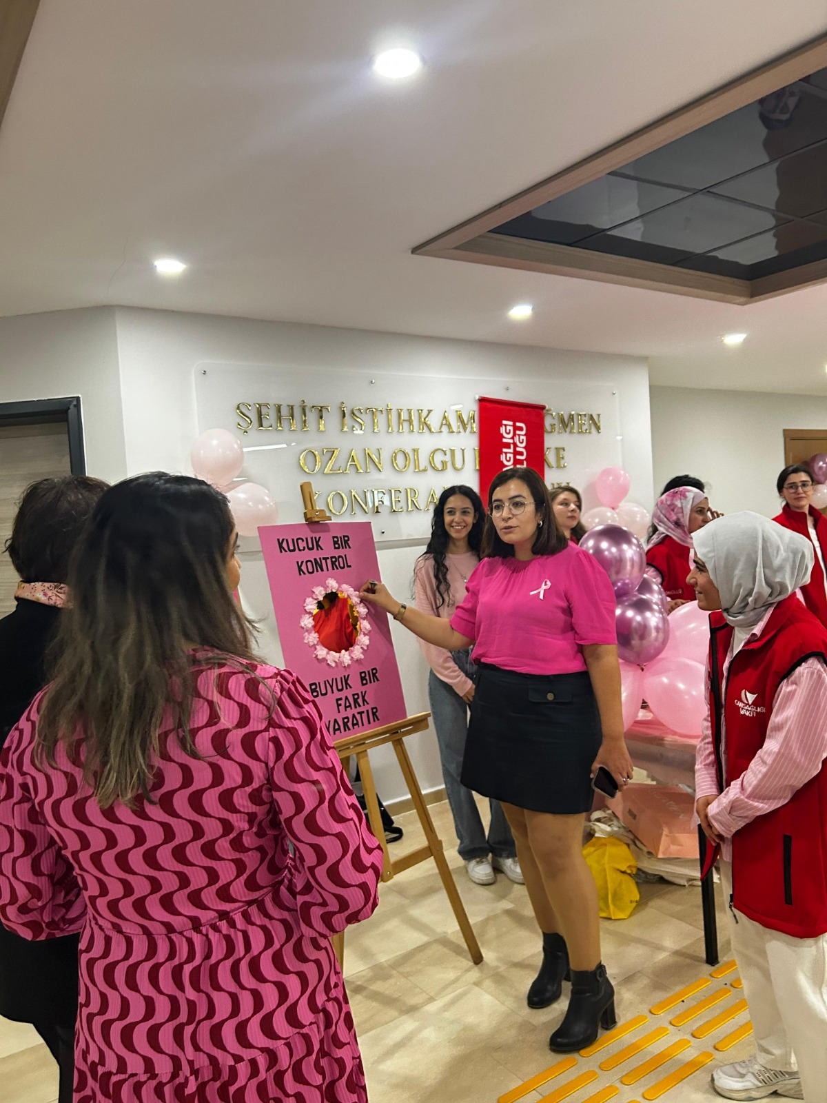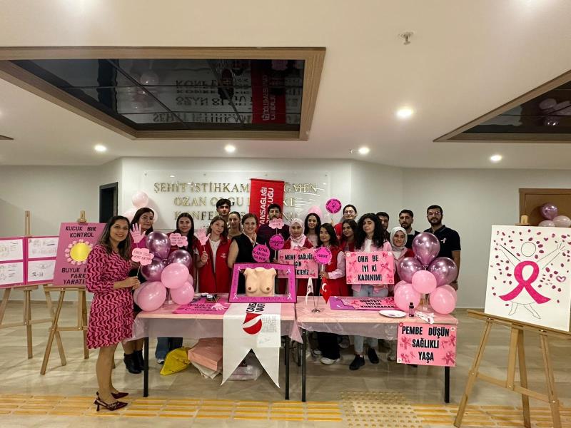 Hemşirelik Bölümümüz tarafından düzenlenen, aynı zamanda etkinliğin moderatörlüğünü üstlenen Dr. Öğr. Üyesi Derya GEZER ve Dr. Öğr. Üyesi Ezgi MUTLUAY YAYLA ve etkinlikte görevli öğrencilerimizin büyük bir heyecan ve özveri ile hazırladığı “Meme Kanseri Farkındalık Etkinliği” 30 Ekim 2025 Perşembe Günü Saat 13:00’de Şehit İstihkam Üsteğmen Ozan Olgu Köreke Konferans Salonu’nda yoğun bir katılımla gerçekleştirildi! Etkinlikte konuşmacı olarak yer alan İç Hastalıkları Uzmanı Medikal Onkolog Uzm. Dr. Halil Çelik tarafından meme kanseri ile ilgili olarak; korunma ve risk faktörleri, belirtileri, teşhis ve tarama yöntemleri hakkında bir konferans verildi. Ayrıca etkinlik kapsamındaki “Kendi Kendine Meme Muayenesi (KKMM)” videosu ile soru sorma fırsatı katılımcıların öz yeterlilik ve farkındalıklarını harekete geçirmelerini, konuyla ilgili merak ettiklerini gidermelerini sağlanmaya çalışıldı. Etkinlik sonrası hazırlanan stantta maket üzerinde KKMM gösterilmiş, çeşitli bilgi broşürü ve afiş çalışmalarıyla farkındalık yaratıldı.