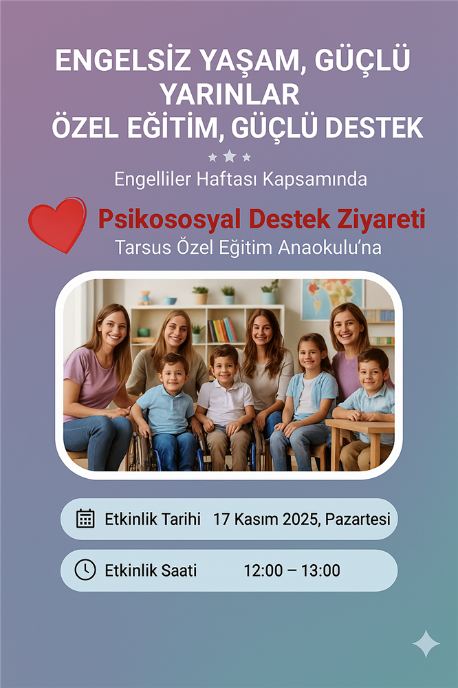 Öğretim Üyemiz Doç. Dr. Aysel AKBENİZ tarafından yürütülen "Hemşirelik ve Mizah" dersi kapsamında Engelliler Haftası dolayısıyla 17 Kasım 2025, Perşembe tarihi saat 12:00-13:00'de Tarsus Özel Eğitim Anaokulu'na Psikososyal Destek Ziyareti düzenlenmiştir. Emeği geçen öğretim üyemiz ve öğrencilerimize teşekkür ederiz.