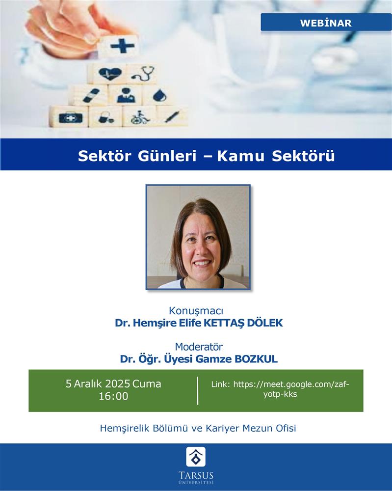 Hemşirelik Bölümü ve Kariyer Mezun Ofisi İşbirliğinde hazırlanan "Sektör Günleri - Kamu Sektörü" adlı webinar 5 Aralık 2025 Cuma Tarihi Saat 16:00'da gerçekleştirilmiştir.