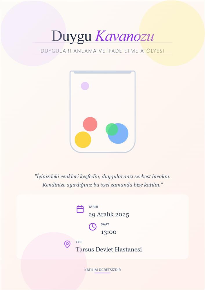 Hemşirelik Bölümü Öğretim Üyelerimizden Doç. Dr. Aysel AKBENİZ tarafından yürütülen "Hemşirelik ve Mizah" dersi kapsamında planlanan "Duygu Kavanozu" etkinliği 29 Aralık 2025 tarihi saat 13:00'de Tarsus Devlet Hastanesi'nde gerçekleştirilmiştir. Etkinlikte emeği geçen öğretim üyemiz, öğrencilerimize ve katılımcılara teşekkür ederiz.