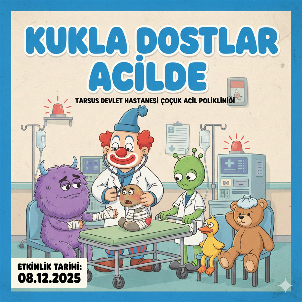 Hemşirelik Bölümümüz Öğretim Üyelerinden Doç. Dr. Aysel AKBENİZ tarafından yürütülen Hemşirelik ve Mizah Dersi kapsamında 08/12/2025 tarihinde Tarsus Devlet Hastanesi Çocuk Acil Polikliniğinde "Kukla Dostlar Acilde" etkinliği düzenlenecektir. Herkes için faydalı bir etkinlik olmasını temenni eder ve etkinlikte emeği geçecek olan öğretim üyemiz, öğrencilerimiz ve katılımcılara teşekkür ederiz.