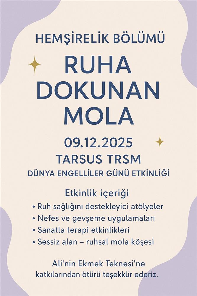 Hemşirelik Bölümümüz tarafınca Dünya Engelliler Günü etkinlikleri kapsamında 09/12/2025 tarihinde Tarsus Toplum Ruh Sağlığı Merkezi'nde "Ruha Dokunan Mola" etkinliği düzenlenecektir. Etkinlik, "ruh sağlığını destekleyici atölyeler", "nefes ve gevşeme uygulamaları", "sanatla terapi etkinlikleri" ve "sessiz alan - ruhsal mola köşesi" başlıklı içeriklere sahip olacaktır. Etkinlikte emeği geçecek herkese şimdiden teşekkür eder, faydalı bir etkinlik olmasını temenni ederiz.