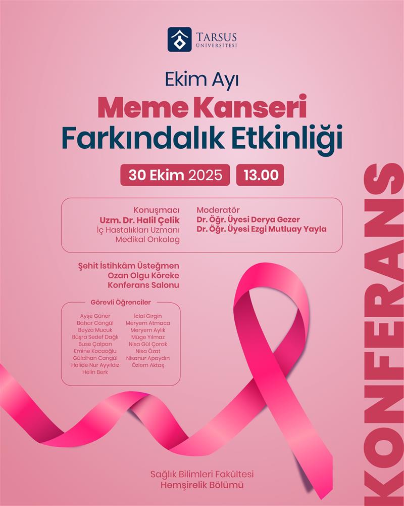 Hemşirelik bölümümüzce, meme kanseri farkındalık ayı kapsamında düzenlenecek olan "Meme Kanseri Farkındalık Etkinliği" 30 Ekim 2025 tarihi saat 13:00'da Şehit İstihkam Üsteğmen Ozan Olgu Köreke Konferans Salonu'nda gerçekleştirilecektir. Moderatörlüğünü öğretim üyelerimizden Dr. Öğr. Üyesi Derya GEZER ve Dr. Öğr. Üyesi Ezgi MUTLUAY YAYLA'nın yapacağı etkinliğe İç Hastalıkları Uzmanı Medikal Onkolog Uzm. Dr. Halil Çelik konuşmacı olarak katılacaktır.