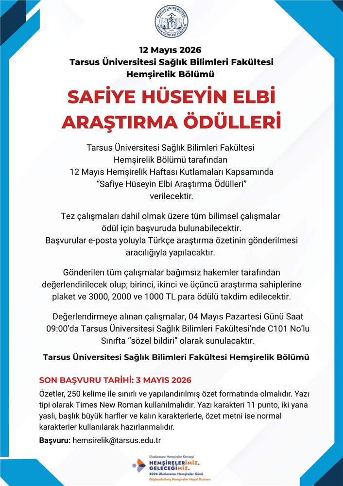 Tarsus Üniversitesi Sağlık Bilimleri Fakültesi Hemşirelik Bölümü tarafından, 12 Mayıs Hemşirelik Haftası kutlamaları kapsamında düzenlenen “Safiye Hüseyin Elbi Araştırma Ödülleri” için başvurular başlamıştır.