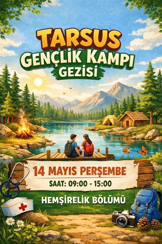 Hemşirelik Bölümümüz 1. ve 2. Sınıf öğrencilerimize yönelik planlanan "Tarsus Gençlik Kampı Gezisi" 14 Mayıs Perşembe Günü 09:00 - 15:00 saatleri arasında gerçekleştirilecektir. Etkinlikte öğrencilerimiz hem dinlenme hem de sosyal etkileşim fırsatı bulacak, doğayla iç içe keyifli ve verimli bir gün geçirecektir.