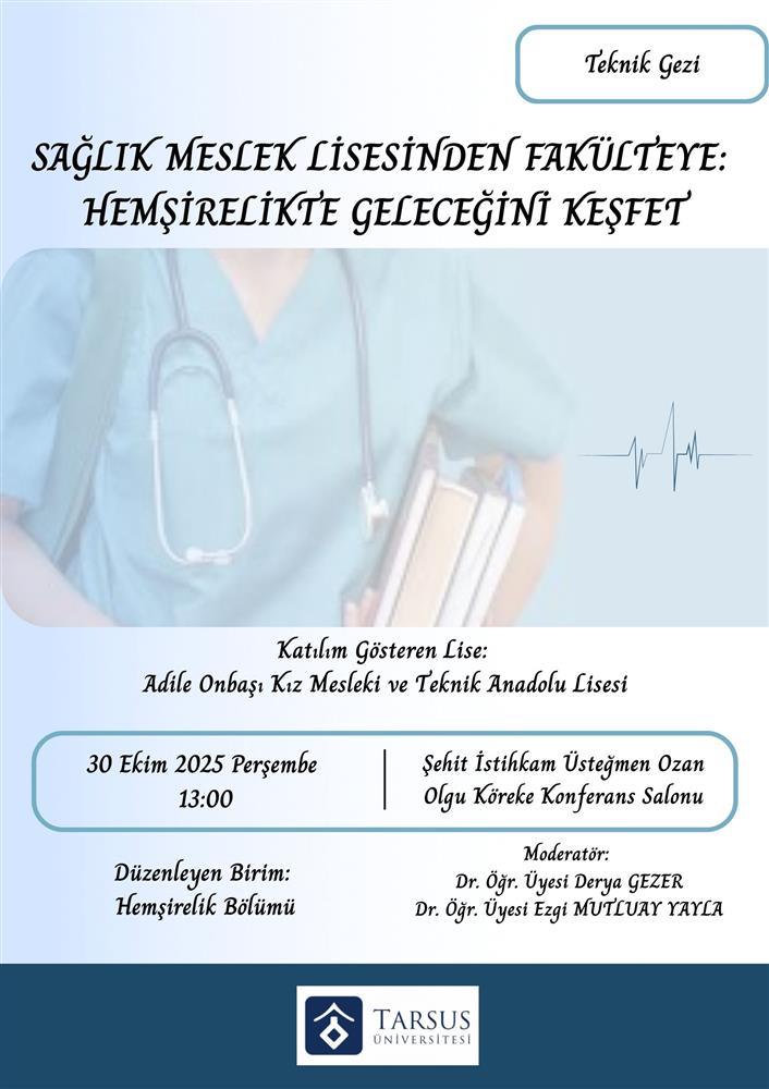 Tarsus Adile Onbaşı Kız Mesleki ve Teknik Anadolu Lisesi öğrencileri, Hemşirelik Bölümümüz tarafından düzenlenecek ve 30 Ekim 2025 Perşembe Günü saat 13:00’de Şehit İstihkam Üsteğmen Ozan Olgu Köreke Konferans Salonu’nda gerçekleştirilecek “Meme Kanseri Farkındalık Etkinliği”ne katılım sağlayacaktır. Etkinliğin ardından Fakültemiz Laboratuvarlarını ziyaret edecek olan öğrencilerin üniversite ortamıyla tanışmasının sağlanması amaçlanmaktadır.